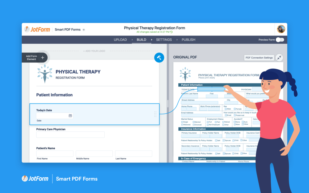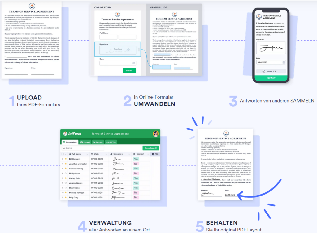 Mit JotForm smart PDF lassen sich Formulare unabhängig vom PDF designen. Die Felder werden anschliessend auf das originale PDF-Formular gemappt. So kann man z.B. zertifizierte und ISO-konforme PDFs trotzdem komfortabel auf einem Smartphone ausfüllen lassen. Man kann sogar existierende PDF-Formulare importieren und die Felder automatisch erstellen lassen.